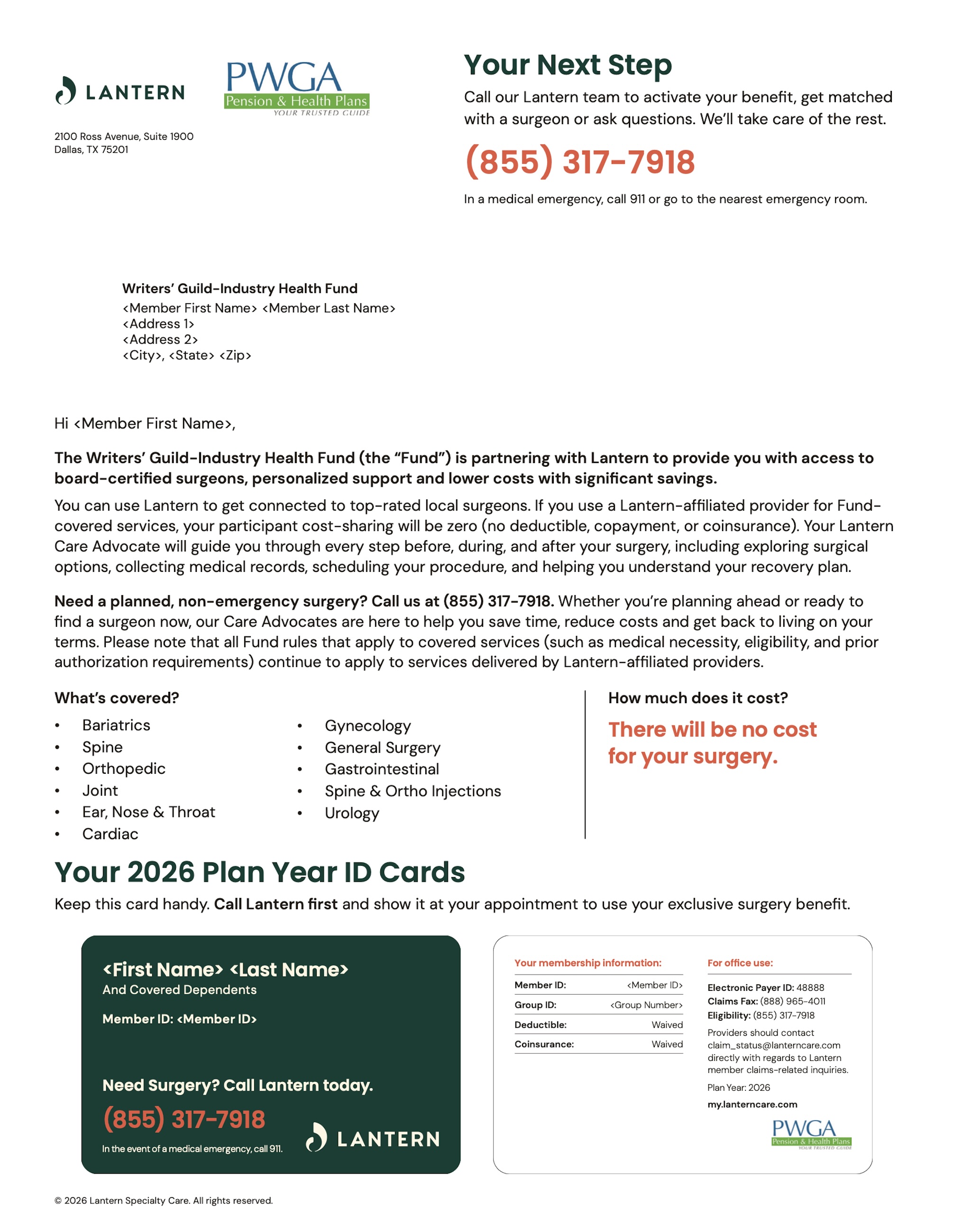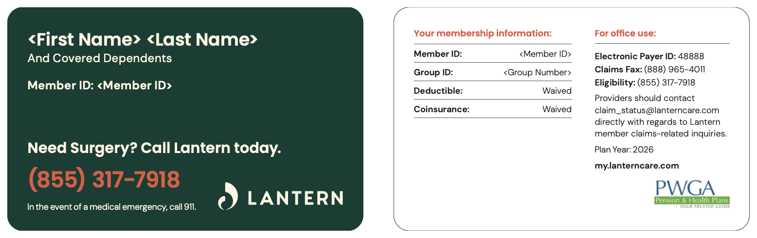 Hold on to the membership card. If you or your dependent(s) need a surgical procedure covered by Lantern, the membership card information will allow you to access Lantern’s resources.